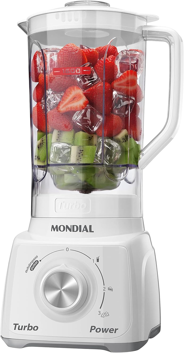 JARRA RESISTENTE: O copo do liquidificador Mondial é feito de San Cristal, material resistente a quedas e riscos, supertransparente e que não pega cheiro ou cor.