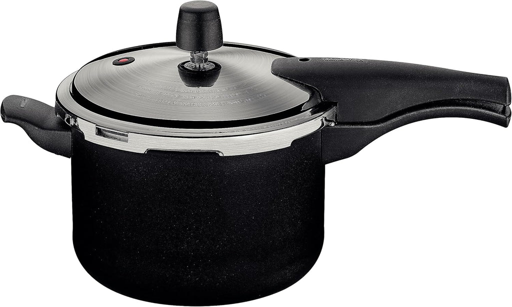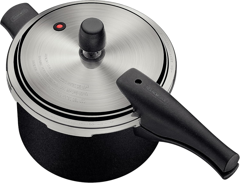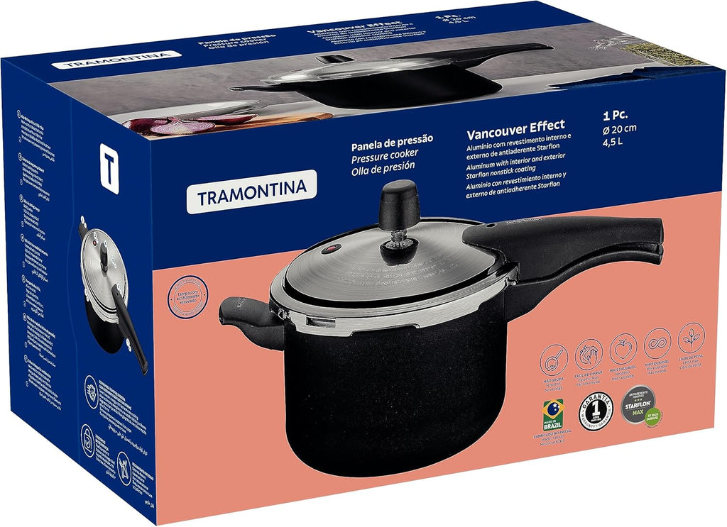 Com a panela de pressão Tramontina Vancouver Effect em alumínio com revestimento interno e externo em antiaderente Starflon Max preto 20 centímetros de diâmetro 4,5 litros você ganha um aliado de alta qualidade para o preparo das suas refeições. Com ela, suas receitas serão um sucesso absoluto e ficam prontas com maior rapidez. Com tampa de alumínio com acabamento externo polido e interno satinado, ela proporciona um encaixe perfeito e mantém a pressão ideal durante todo o preparo das refeições. Para garantir sua segurança, a panela conta com alças e cabos superiores e inferiores em baquelite antitérmico, oferecendo assim, maior conforto e estabilidade ao manuseá-la.Escolha as panelas de pressão Tramontina Vancouver e tenha um item que se adapta ao seu estilo de vida na cozinha e eleva suas habilidades culinárias!